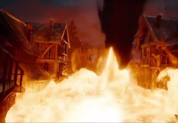 La anterior película “La desolación de Smaug” nos permitió ver unos breves momentos del enorme poderío del legendario dragón, considerado como uno de los seres más violentos y destructivos en la historia de la Tierra Media. A pesar de ellos, “La batalla de los cinco ejércitos” nos mostrará la ira absoluta del personaje. Sobra decir que el lugar sufrirá grandes daños y que muchas vidas se perderán en la batalla contra el dragón.