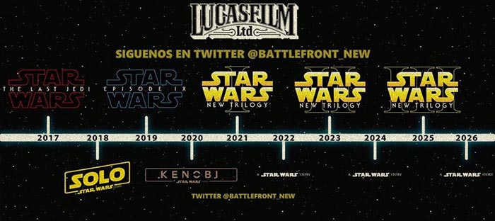 En los próximos años veremos 10 películas de Star Wars. Tras confirmarse los planes de Lucasfilm recientemente, sabemos que habrá una nueva trilogía galáctica que se sumará a los planes de los spin-offs llamados Star Wars Anthology. Que sepamos en estos momentos, los planes del estudio presidido por Kathleen Kennedy pasan por cumplir con una película anual. Por lo que la lista provisional de las futuras películas de la franquicia es la siguiente, publicada por nuestros amigos de @Battlefront_New:
