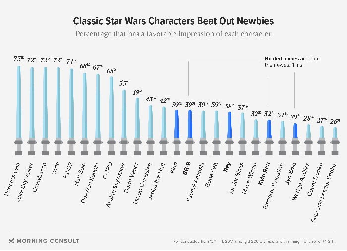 Tenemos un ranking con los 25 mejores personajes de la saga Star Wars. Solo quedan unas horas para ver el estreno del Episodio VIII de la franquicia galáctica: ‘Los Últimos Jedi‘. La cinta, que ya ha sido visualizada por el propio George Lucas, es uno de los estrenos más esperados de 2017. Por ese motivo, como recoge Comic Book Movie, se ha realizado una encuesta entre los fans para sacar una lista con los 25 mejores personajes de Star Wars. Fue realizada entre el pasado 1 y 4 de diciembre. Un total de 2.200 adultos participaron de ella. El resultado es el siguiente: