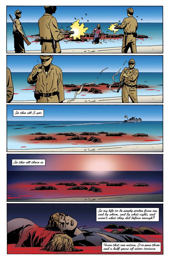 Garth Ennis nos pone en el lugar de una mujer ultrajada, pero dura como la piedra. Nos cuenta a través de los recuerdos y las explicaciones de una carta a su gran amor lo cruel de la guerra, nada que ver con heroicas batallas y grandes victorias, sin sacrificios para recordar o grandes acciones que cambian la dirección de la guerra. Sólo dolor, amor, y un rencor que retuerce las tripas. Ennis es un habil narrador, conocido por su vis cómica y su capacidad de destruir las bases de cualquier genero, de regenerarlo o de alterar la visión del mismo, aquí se deja de artificios y cuenta la historia de una mujer desde que murió y volvió a la vida dos veces, cuando la salvaron, y cuando conoció a Billy. Directo a las vísceras, sin concesiones, así son las historias del norirlandés cuando quiere contar la realidad asquerosa y dolorosa que hay en la guerra.