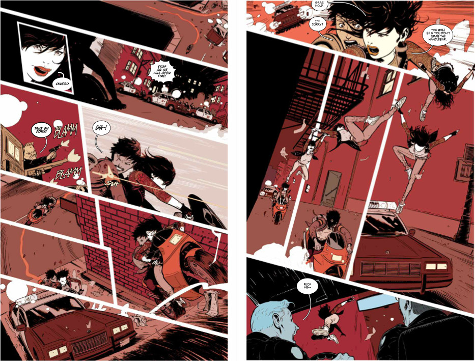 Y si Remender se esfuerza con la historia, el arte que transforma las palabras en imágenes poderosas es notable. Wes Craig crea una película de acción en la que la espectacularidad y la velocidad envuelve al público casi sin notarlo. Composiciones visuales complejas y que se absorben en un vistazo, que repasas por vivirlas totalmente, por masticar toda su potencia. Pero no sólo de acción vive el hombre, el guión tiene muchos diálogos largos y no pesa el texto a las imágenes. Además, Craig es capaz recrear esos pasillos del instituto como lo que eran para los estudiantes, laberínticas paredes y clases tenebrosas, bien es cierto que la ficticia institución tiene ese aspecto, pero es también el que muchos veían en sus escuelas. Todo envuelto en un color poderoso que reafirma las escenas y potencia la vida y la fuerza de los personajes.