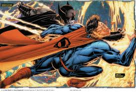 Batman se enfrenta en unas breves páginas al Hombre de Acero en un combate con grandes toques de tensión y violencia y en el que de nuevo el Caballero Oscuro, con un enorme traje que parece metálico, consigue hacer sangrar al kryptoniano a través de sus instrumentos y armas. Algo similar, pero sin trajes especiales, sucede en el combate que llevan a cabo ambos en el cómic, publicado en 2014 en Estados Unidos, ‘Batman / Superman #7’ en el que los dos están atrapados por Toymaster y Mongul. El guionista de la historia es Greg Pak y los ilustradores son Norm Rapmund y Brett Booth. Las viñetas de esta dura pelea muestran que Batman consigue poner en jaque de nuevo a Superman.