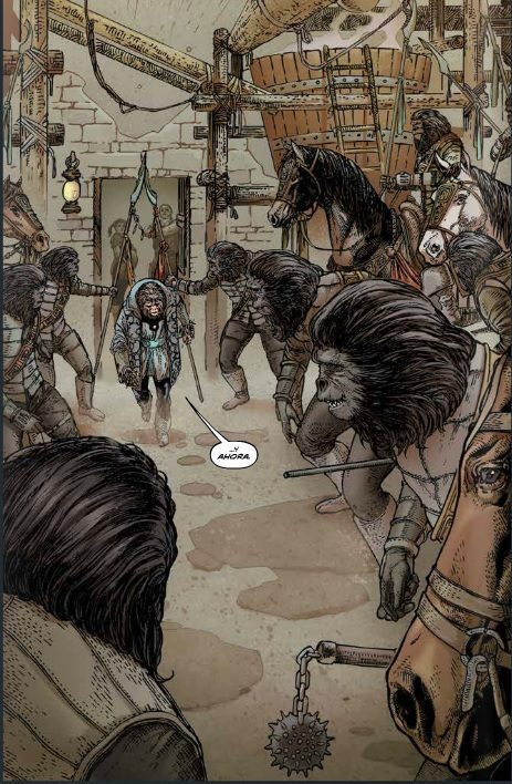 Interesante premisa la de adentrarnos en el pasado del planeta de los simios antes de la llegada del Coronel Taylor, el personaje de Charlton Heston en el clásico de 1968 , partiendo de las secuelas y sobre todo de aquella serie de televisión que establecía una coexistencia pacífica entre simios y hombres, entramos en un nuevo mundo. En él la sociedad distingue entre señores y siervos, casi de forma medieval, pero mantiene cierto estatus los humanos. Pero bajo la superficie el orgullo siempre existe y los hombres no quieren ser esclavos de aquellos que no son hombres. NO sólo hablamos de razas, también de las creencias que dan forma a la rebelión, la religión, la libertad, la juventud. Todo ello aderezado por un ambiente de revolución industrial, hablamos de la época donde más revoluciones de pensamiento se crearon, tanto liberal como obrero.