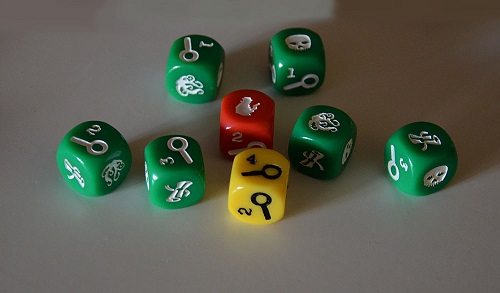 El juego, básicamente consiste en resolver una serie de cartas de aventuras lanzando para ello seis dados verdes y en caso de tener cartas especiales de objeto podremos tirar un dado rojo o un dado amarillo.