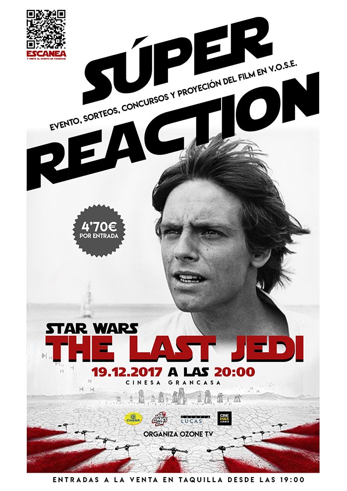 Ozone TV y Cinesa Gran Casa con la colaboración de Galaxia Lucas y Cinemascomics presentan el Super Reaction de ‘Star Wars: Los Últimos Jedi‘ que tendrá lugar el próximo martes 19 a las 20:00 en los cines Cinesa de Gran Casa. Por un precio especial de 4.70€ podrás disfrutar de un proyección en V.O.S.E de la película más esperada del año además de ser protagonista y participe de la auténtica fiesta de Star Wars.