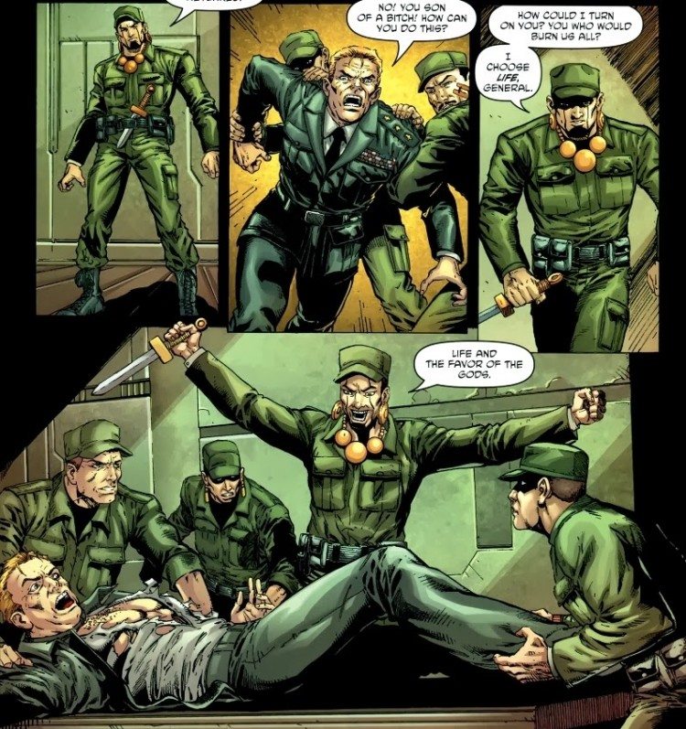 Jonathan Hickman forma parte de esta serie como creador y guionista con Mike Costa, pero no es el responsable total de ella, y se nota. El argumento tiene muchos aspectos explotables y muchas posibilidades, pero en este primer arco se limitan a explicar el orgullo, la envidia y la competitividad de los dioses, y de los humanos que prefieren morir a servirlos. Hay buenas ideas que se exponen, pero ni profundiza ni retoma una vez explicadas. Casi las historias cortas finales resultan más atractivas pro ser potentes y no dar vueltas sobre demasiadas ideas sin coger ninguna. La verdad que una vez terminado suena demasiado manido, como si lo hubieras leído ya en algún otro lugar. Y es así, el poder corrompe, el poder absoluto corrompe absolutamente, o un gran poder conlleva una gran responsabilidad, o si no estás conmigo estás contra mi, vamos que es tan general el tratamiento de la idea que podrías insertar casi cualquier cita bíblica o de otra religión o las ya conocidas frases de los superhéroes. No creo que Mike Costa y Hickman se hayan infraesforzado, es sólo que demasiado material que no se usa acaba siendo mas un estorbo que un interés real.