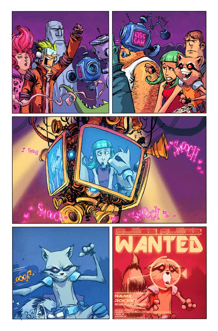 Necesitaba alguien que pudiera unir la entrañable imagen de un “osito lavador”, los mapaches son parientes de los pandas por si alguien no lo sabía, con el destructivo poder de un mercenario espacial que sabe tanto de armas como de insultos. Y por ahí estaba el tipo que ha dibujado la versión marvelita del Mago de Oz, el hombre que dibuja las portadas mas monas y divertidas de los últimos años, y tenía ganas de acción tras tanto algodón de azúcar y pastelitos. Skottie Young estaba destinado para contar la historia de Cohete.