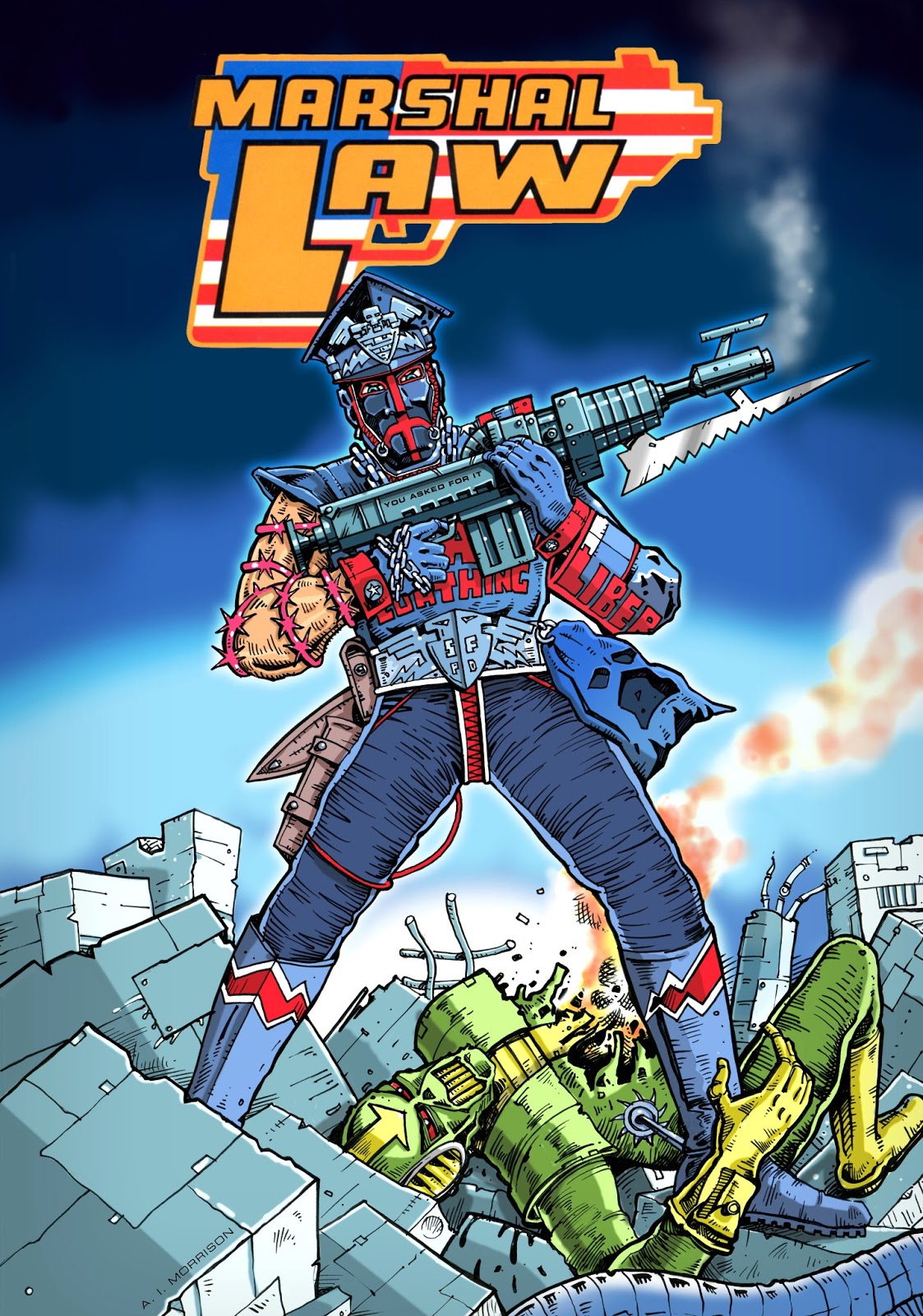 Siempre ha existido una literatura satírica, pero el mundo del cómic no solía hacer una lectura paródica de sus obras, al menos no de una forma inteligente. Mills decidió que era hora de plantearla. Y así nació Marshal Law, el cazador de héroes, un policía brutal que controla a los superhéroes que están fuera de control. El problema es que parece que todos los tipos en mallas son culpables a sus ojos, todos están locos. “Estoy buscando un héroe… Todavía no lo he encontrado” es la frase lapidaria que el agente del orden utiliza hasta la saciedad para mostrar su rechazo hacia las personas que creen que sus poderes y un uniforme chillón los vuelve mejores, superiores a la gente normal y con derecho a todo. ¿Suena a algo más reciente? Sí, a ‘The Boys’ de Garth Ennis y Darrick Robertson. Con esta premisa nos encontramos un futuro desolador donde una gran guerra ha forzado a crear superhéroes para combatir en la misma como armas definitivas y estos vuelven del conflicto llenos de problemas psíquicos y sociales con un mundo que no entienden, que no los necesita, un mundo de pequeños seres inferiores y débiles que pueden aplastar. Sí, lo sé, suena a muchos cómics de Mark Millar y Warren Ellis.
