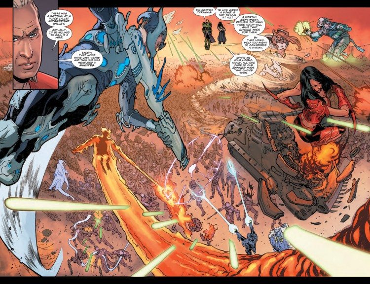Y luego vuelve nuestra chica preferida, Elena Casagrande, que sigue en forma y como siempre demuestra que es capaz de adaptarse a cualquier tipo de historia, y esta, ‘Riesgo Suicida’, es un gran dialogo, un gran monologo y una espesa trama que cuenta con agilidad y canónicamente. Planteamientos fáciles para que la fuerza recaiga en lo que se cuenta, y se complementa con lo que muestra la italiana. Lo mejor sin duda es que el trazo cambia ligeramente, cuanto más se asienta Réquiem mas estable es el trazo y cuando más se altera más se anima la artista a recurrir a lineas mas gruesas y poderosas. Sus diseños de los nuevos elementos y personajes así como la tecnología extraplanar son notables, y de una simplicidad asombrosa, que rivaliza con su fuerza.