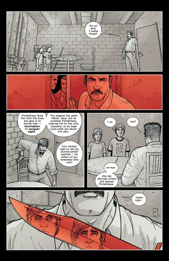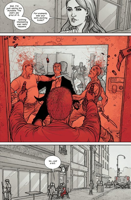 El arte corre a cargo de Ryan Bodenheim, y realiza un gran trabajo, sobre todo apoyándose en el color, el uso del mismo da el marco de las acciones, de las sensaciones en los diálogos. Los personajes están definidos por ese ambiente, y el color del mismo ilumina la escena y la percepción se une a la emoción. Notable este dibujante americano en las secuencias de conversación, pero eso no quita que sea espectacular como una película de acción cuando llega el tiroteo. Todo eso unido con una capacidad narrativa seria y de ritmo constante.