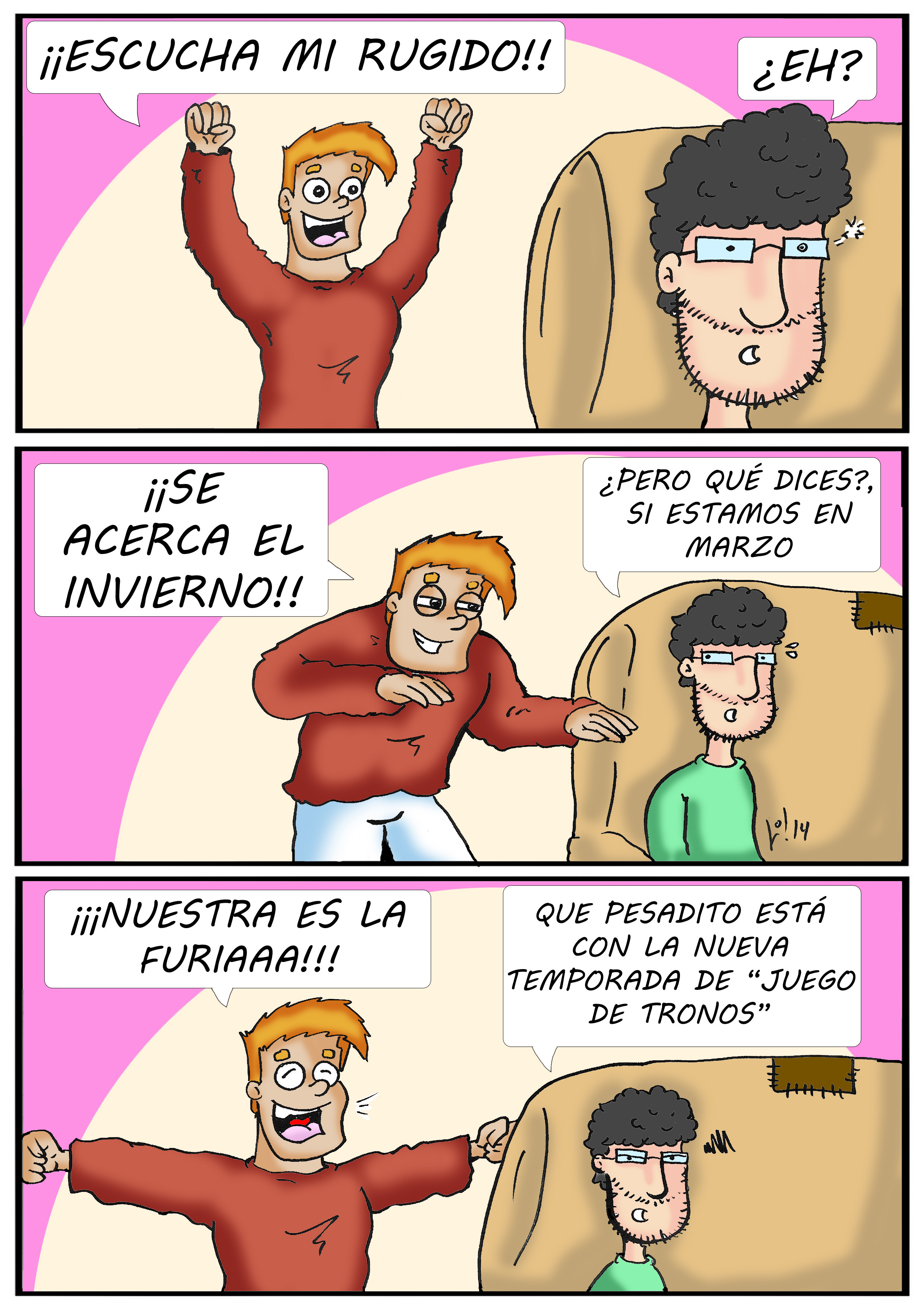 tira 054La serie de Juego de Tronos sigue siendo una de las mejores de la actualidad. Por ahora los personajes se están situando en el tablero de ajedrez que es Poniente.Lo bueno de cada temporada es que ofrece mucha acción, amor, pasión, engaños, venganzas y batallas. La fantasía épica nunca estuvo tan de moda.