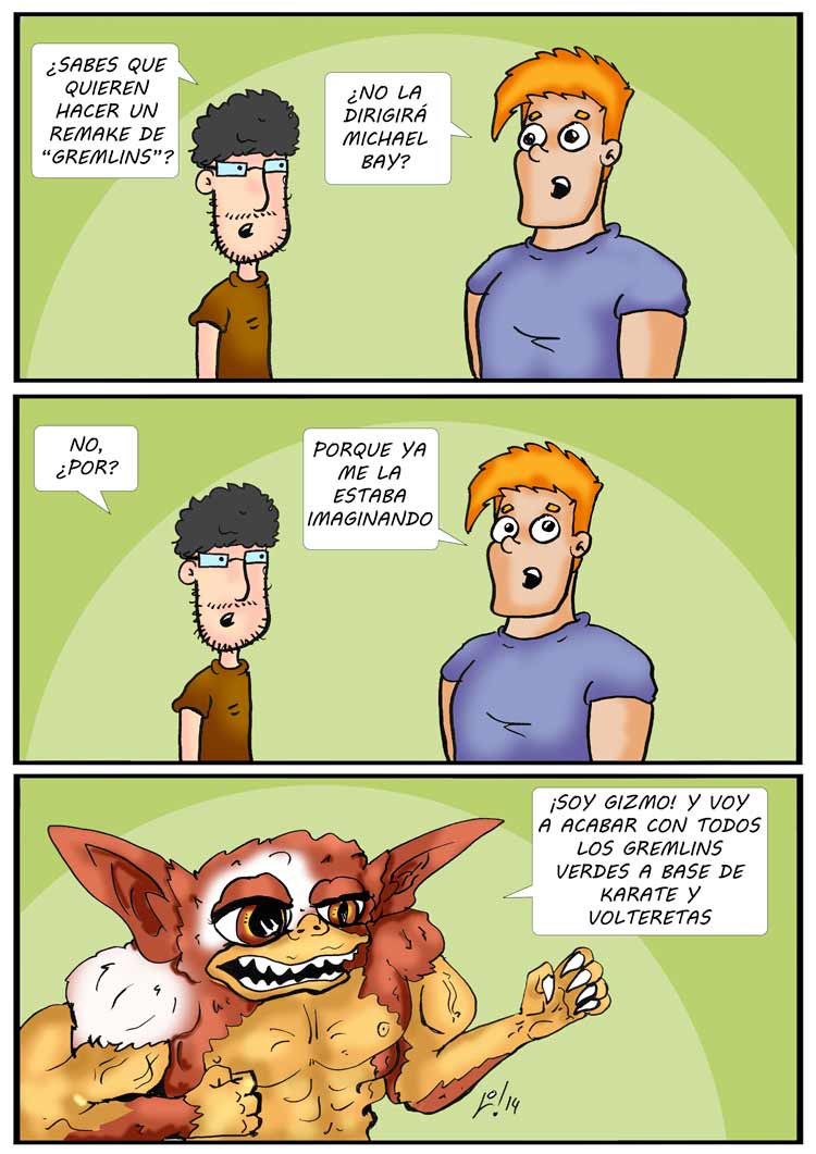 Willy, extra de cine y friki no quieren que le toquen un clásico el terro. La falta de originalidad de Hollywood se refleja en la amplia lista de ‘remakes’ en proceso de desarrollo. Como buen aficionado al cine, a Willy no le convence la continua revisión de clásicos o incluso de películas recientes. Nuestro amigo se ha quedado impactado con el nuevo proyecto en torno a la ochentera ‘Gremlins’, tanto que ya se imagina qué ocurriría si su ‘adorado’ Michael Bay estuviera vinculado a la película. El agua ya no transformaría a los adorables gremlins porque los monstruitos, al estilo de las tortugas ninja, irían hasta arriba de esteroides…