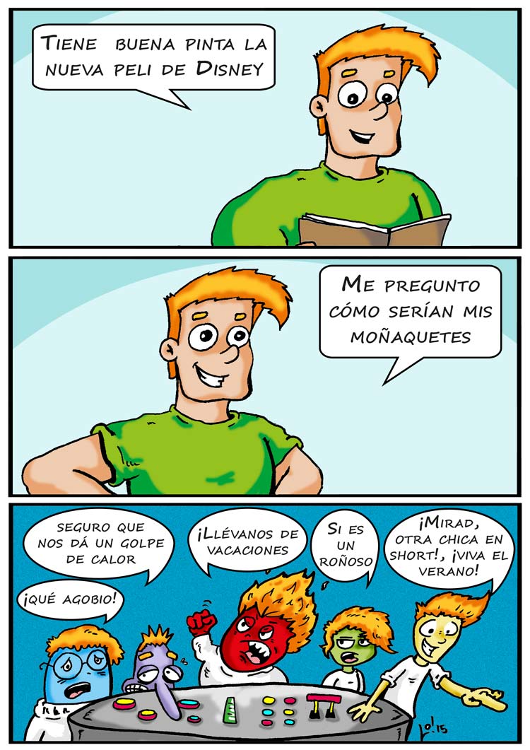 En la tira número 94 ‘Willy, extra de cine y friki’. Nuestro amigo Willy que es un amante del Universo de Pixar Studios, aguarda con entusiasmo el estreno de ‘Del revés (Inside Out)’ mientras se imagina cómo funciona su cerebro, dirigido por peculiares muñecos / emociones.